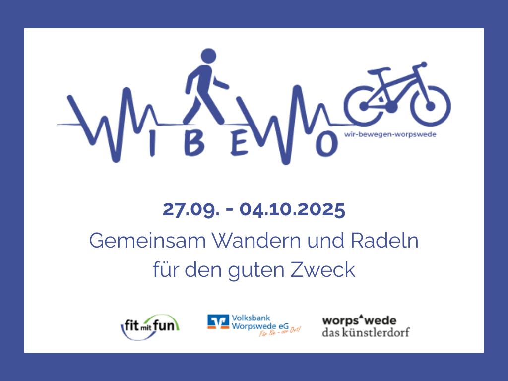Für die Aktionswoche haben wir 4 Fahrrad- und 4 Wanderrouten in und um Worpswede zusammengestellt. Am Samstag, den 04. Oktober 2025 gibt es eine geführte Radtour sowie eine geführte Wandertour, die zum gemeinsamen Abschluss auf den Marktplatz Worpswede führen, begleitet von Mitgliedern der „Gästeführer WORPSWEDE-TEUFELSMOOR e.V.“ und des fit mit fun-Teams. Hier erwartet dich der Wochenmarkt mit kulinarischen Genüssen und die Volksbank Worpswede eG als Sponsor, die das Spendenschwein in der gesamten WIBEWO-Woche für jeden gefahrenen Radkilometer mit 0,10€ und für jeden erlaufenen Wanderkilometer mit 0,25€ füttert. Mit der Spendensumme unterstützen wir sowohl den „NABU, Ortsgruppe Worpswede“ als auch die „Stiftung Worpswede“.